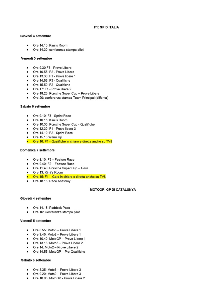 FORMULA 1 A MONZA – Il weekend del Gran Premio più veloce della stagione inizia giovedì 4 settembre con la conferenza stampa dei piloti, alle 14.30. Venerdì si scende in pista, con la prima sessione di libere in programma alle 13.30, mentre la seconda scatterà alle 17.00. Sabato pomeriggio alle 13.30 l’ultima sessione di libere prima delle qualifiche, in programma alle 16.00. Domenica via alla gara, in esclusiva live dalle 15.00 su Sky Sport Uno, Sky Sport F1, Sky Sport 4K e in streaming su NOW. Diretta in chiaro qualifiche e gara anche su TV8. Nel weekend di Monza in pista anche F2, F3 e Porsche Supercup.