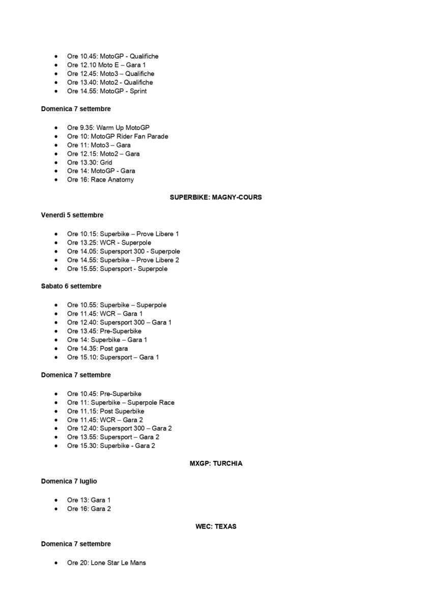 SUPERBIKE A MAGNY-COURS – Nel fine settimana torna la Superbike con il Round di Francia. Sabato, a Magny-Cours, è tempo di Superpole alle 10.55 (Sky Sport Max e NOW), anticipo di Gara 1 prevista alle 14.00 (Sky Sport Uno, Sky Sport Max e NOW). Domenica, alle 11.00, la Superpole Race (Sky Sport Max e NOW), mentre chiude il weekend Gara 2 alle 15.30 (Sky Sport Max e NOW).