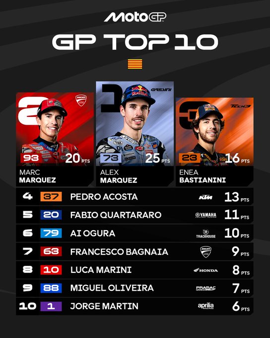 Al termine del quindicesimo Gran Premio della stagione, Marc Márquez sale a quota 487, portando a 182 punti il suo vantaggio su Alex Márquez. Francesco Bagnaia è terzo, a 250 lunghezze di distacco dal compagno di squadra. Il Ducati Lenovo Team resta saldamente al comando della classifica a squadre con 724 punti, con Ducati già vincitrice del titolo costruttori. Il Ducati Lenovo Team tornerà in azione venerdì 12 settembre al Misano World Circuit Marco Simoncelli per affrontare il Gran Premio di San Marino e della Riviera di Rimini.