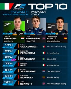 Quinto al traguardo, Leonardo Fornaroli ha consolidato il suo vantaggio nella classifica generale del campionato piloti. Il rookie piacentino, scattato dall’ottava piazzola in griglia, si è distinto per un avvio aggressivo arrivando ai ferri corti con gli avversari tanto da perdere, nel corso del secondo giro, anche la bandella laterale dell’alettone anteriore. Incurante del flap perso e scivolato fuori dalla zona punti, Fornaroli ha proseguito la sua gara. Il portacolori di ACI Team Italia ha saputo sfruttare al meglio le tre neutralizzazioni, con altrettanti ingressi della safety-car, per scalare la classifica. L’ultimo sorpasso, a due terzi di gara, ha consentito all’alfiere del team Invicta Racing di artigliare il quinto posto. Risultato che gli consente di chiudere il fine settimana di Monza con un vantaggio di ventuno lunghezze sul primo degli avversari Luke Browning.