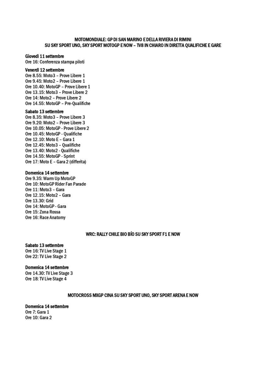 MOTOMONDIALE AL MISANO WORLD CIRCUIT – Il Gran Premio di San Marino e della Riviera di Rimini del Motomondiale entra nel vivo giovedì con la conferenza stampa piloti alle 16. Venerdì, alle 10.40, in programma la prima sessione di prove libere; a seguire, alle 14.55, partono le prequalifiche. Sabato, alle 10.05, la seconda sessione di prove. Dopodiché, alle 10.45, appuntamento con le qualifiche, mentre alle 14.55 scatta la Sprint. Chiude la tre giorni al circuito di Misano la gara, con il semaforo verde previsto alle 14. In pista anche Moto2, Moto3 e Moto E.
