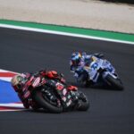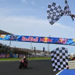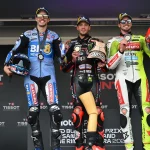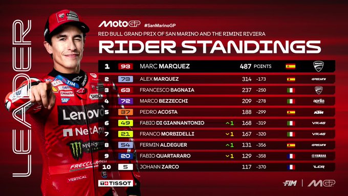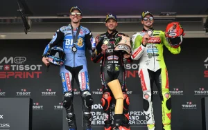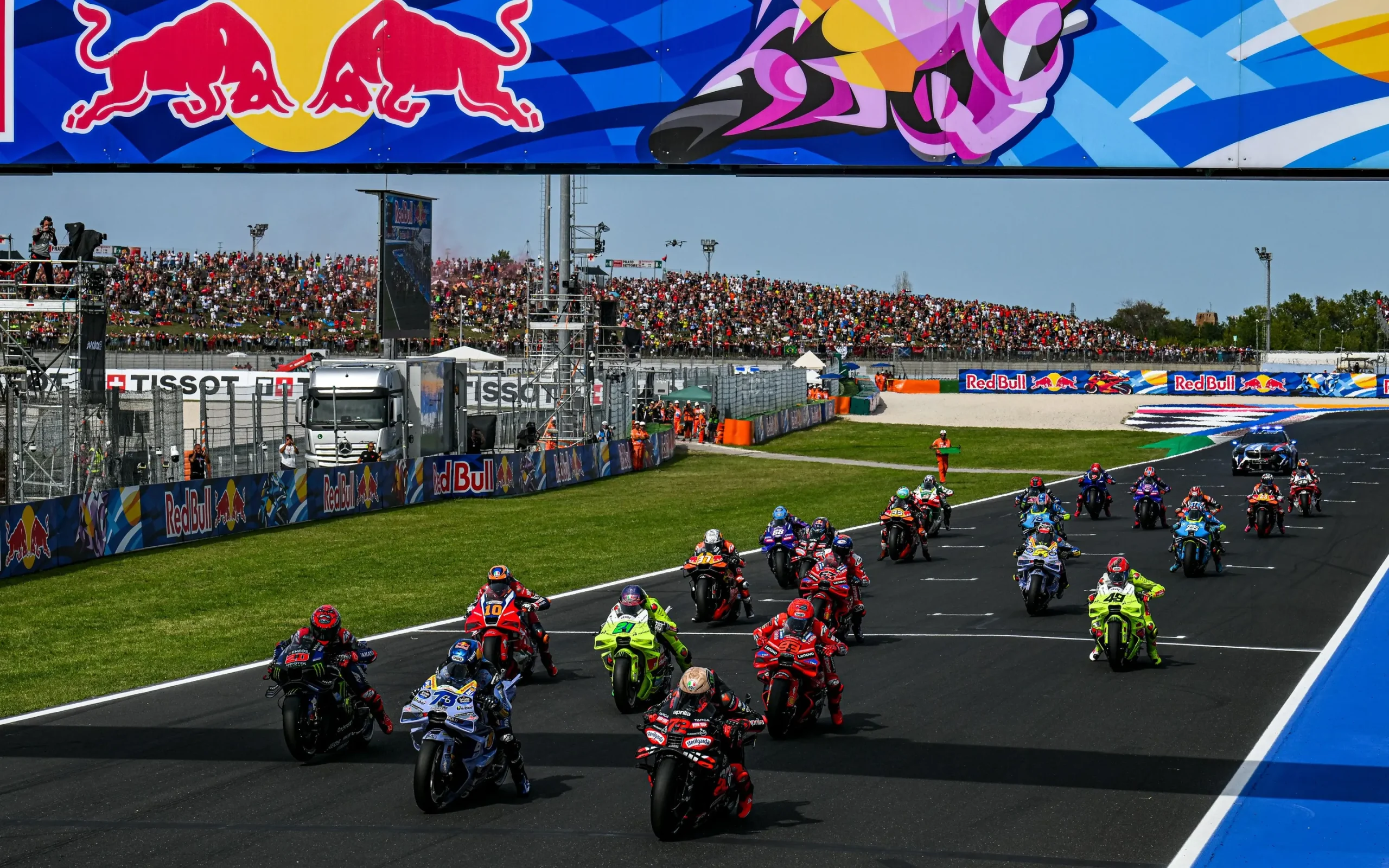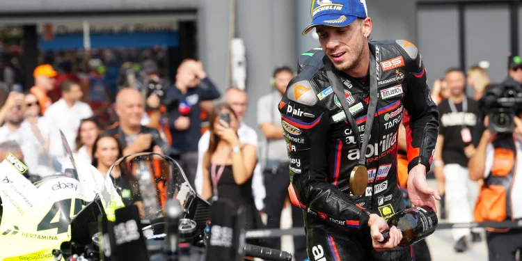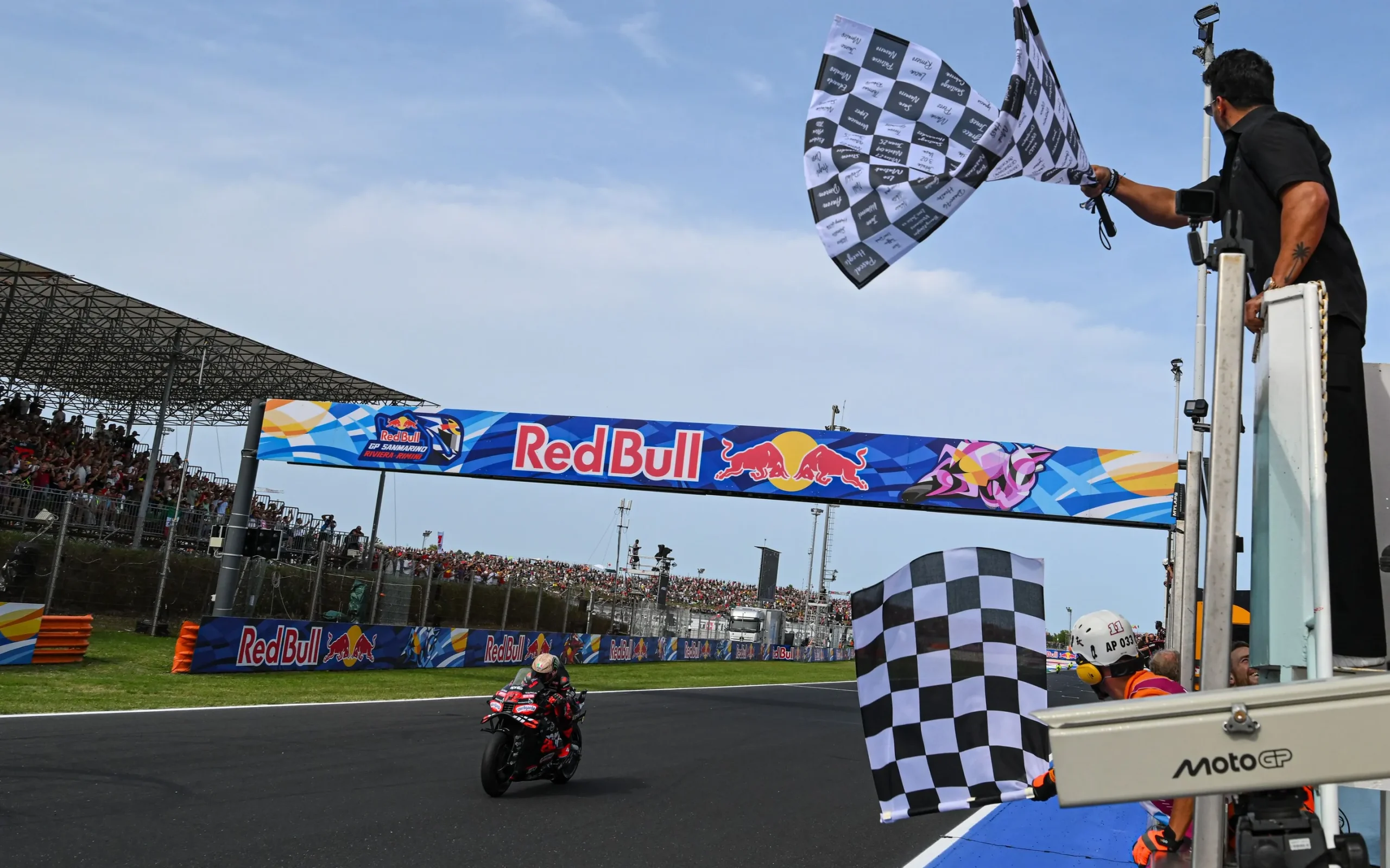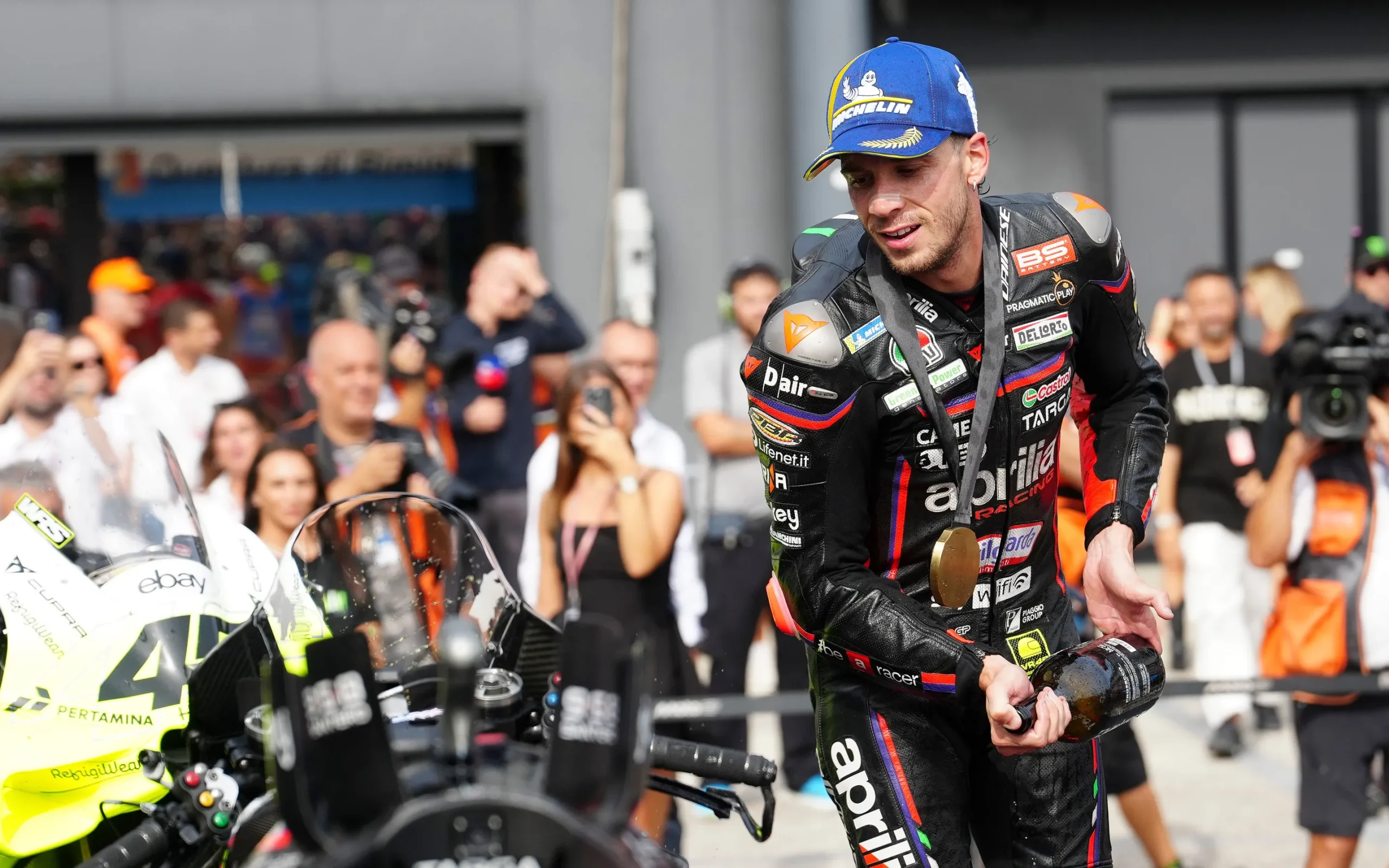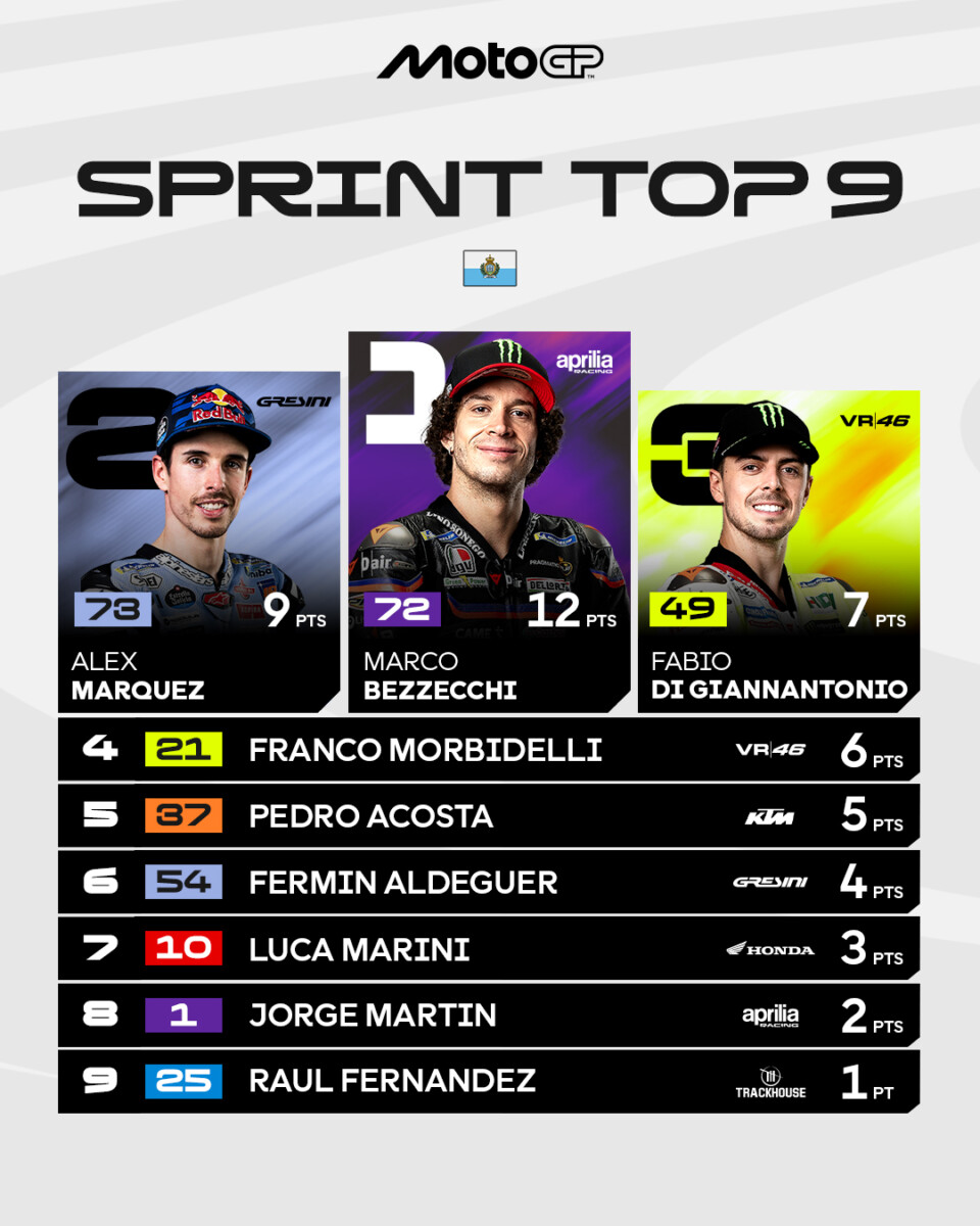 Marco Bezzecchi (Aprilia Racing) vince la Sprint del Gran Premio Red Bull di San Marino e della Riviera di Rimini approfittando anche della caduta del leader Marc Marquez (Ducati Lenovo Team). ‘Bez’ festeggia davanti a tantissimi tifosi che hanno preso d’assalto la pista di Misano e precede Alex Marquez (BK8 Gresini Racing MotoGP). Il podio è completato da Fabio Di Giannantonio (Pertamina Enduro VR46 Racing Team).