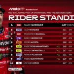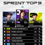 Al sesto giro Marc Marquez va in testa e prova ad allungare ma perde l’anteriore e cade in curva 15, lasciando pista libera a Bezzecchi. Per lo spagnolo è la prima Sprint del 2025 senza punti ma a Motegi avrà il primo match point per conquistare il settimo Titolo mondiale in top class. Sabato pomeriggio molto positivo per il team VR46 che piazza al quarto posto Franco Morbidelli, seguito da Pedro Acosta, Fermín Aldeguer e Luca Marini. Jorge Martín chiude ottavo precedendo Raul Fernandez (Trackhouse MotoGP Team) ed Enea Bastianini (Red Bull KTM Tech3). Altro sabato negativo per Bagnaia, solo 13°.