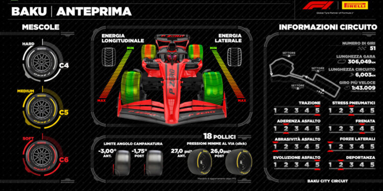 Pirelli ha scelto per il GP dell’Azerbaigian la terna di mescole più morbida della gamma 2025, uno step quindi più soft rispetto allo scorso anno. Torna infatti in pista la C6 come Soft – si era già vista a Imola, Monaco e Montreal – mentre la C5 sarà la Medium e la C4 la Hard. Su una pista cittadina dove i livelli di grip e usura sono molto bassi mantenere la stessa selezione del 2024 avrebbe inevitabilmente indirizzato la strategia verso una sola sosta mentre almeno così, anche alla luce del fatto che la gamma di quest’anno patisce in maniera molto minore il fenomeno del graining– si può aprire anche una possibilità per le due soste. Peraltro, l’esperienza di quest’anno – a Monza l’ultimo esempio – dimostra che le squadre e i piloti hanno sviluppato una grande capacità di gestione degli pneumatici tanto che sarà comunque difficile vedere strategie molto differenziate. Pur essendo un circuito cittadino, il tracciato di Baku presenta alcuni rettilinei molto lunghi dove si raggiungeranno velocità molto elevate, esercitando così importanti carichi verticali sui pneumatici.