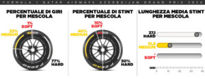 La C4 (Medium) fu la mescola scelta dalla maggior parte dei piloti (14) per il primo stint mentre gli altri optarono per la C3 (Hard). Nelle prime cinque file della griglia solamente Norris (McLaren) e Albon (Williams) optarono per la mescola più dura. Come sopra citato, la strategia prescelta da tutti fu quella su una sosta. Chi si fermò due volte lo fece o per causa di forza maggiore (foratura) nel caso di Stroll o per guadagnare il punto extra per il giro più veloce (Verstappen). Lo stint più lungo fu quello di Pierre Gasly (50 giri con le Hard), che si fermò al penultimo giro per completare la corsa su un set di Soft.