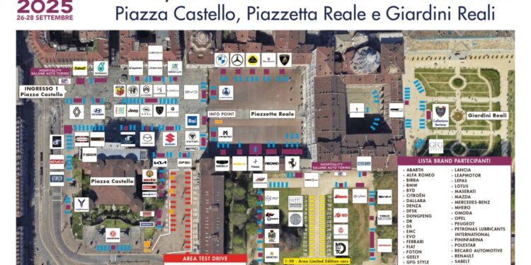 È stata rilasciata la mappa di Salone Auto Torino 2025, con il posizionamento dei 50 brand automotive: Abarth, Alfa Romeo, Birba, BMW, BYD, Citroën, Dallara, DENZA, DFSK, Dongfeng, DR, DS, EMC, Evo, Ferrari, Foton, Geely, GFG Style, Hyundai, ICH-X, Italdesign, Jaecoo, Jeep, KIA, Lamborghini, Lancia, Leapmotor, Lepas, Lotus, Fiat, Maserati, Mazda, Mercedes-Benz, MHero, Omoda, Opel, Peugeot, PETRONAS Lubricants International, Pininfarina, Polestar, RECARO Automotive, Renault, Sabelt, Sparco, Sportequipe, Suzuki, SWM, Tesla, Tiger, Voyah.