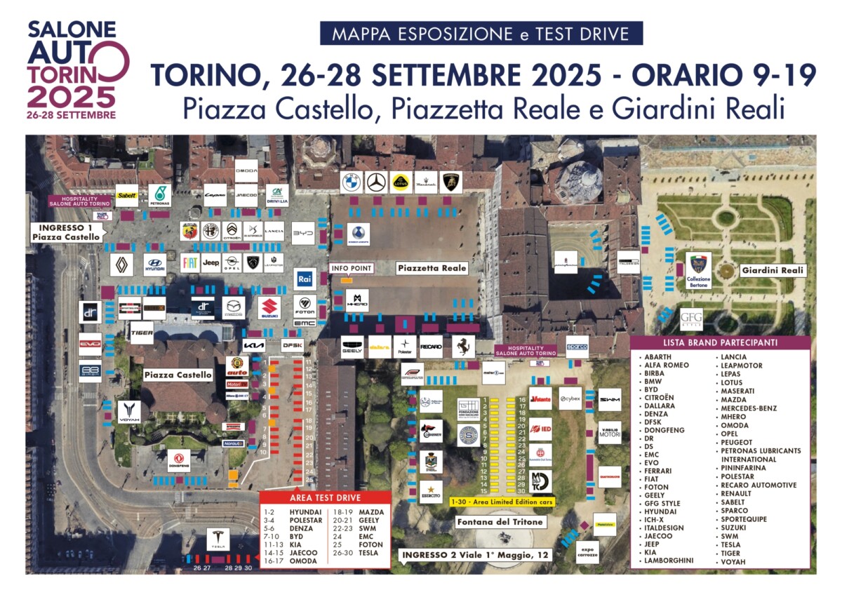 È stata rilasciata la mappa di Salone Auto Torino 2025, con il posizionamento dei 50 brand automotive: Abarth, Alfa Romeo, Birba, BMW, BYD, Citroën, Dallara, DENZA, DFSK, Dongfeng, DR, DS, EMC, Evo, Ferrari, Foton, Geely, GFG Style, Hyundai, ICH-X, Italdesign, Jaecoo, Jeep, KIA, Lamborghini, Lancia, Leapmotor, Lepas, Lotus, Fiat, Maserati, Mazda, Mercedes-Benz, MHero, Omoda, Opel, Peugeot, PETRONAS Lubricants International, Pininfarina, Polestar, RECARO Automotive, Renault, Sabelt, Sparco, Sportequipe, Suzuki, SWM, Tesla, Tiger, Voyah.