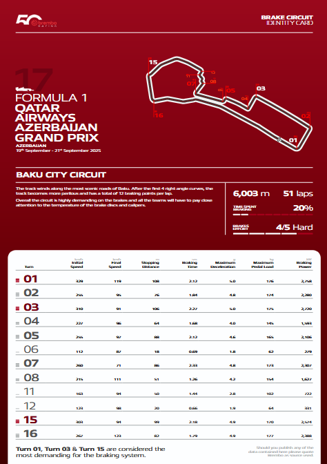 La curva più dura del Baku City Circuit per l’impianto frenante è la 1: le monoposto vi arrivano a 329 km/h e scendono a 119 km/h in 2,12 secondi durante i quali percorrono 108 metri. Lo sforzo richiesto ai piloti è di 5 g, identico alla curva 3, ma il carico che esercitano sul pedale del freno è superiore, 176 kg. La potenza frenante è invece di 2.758 kW.
