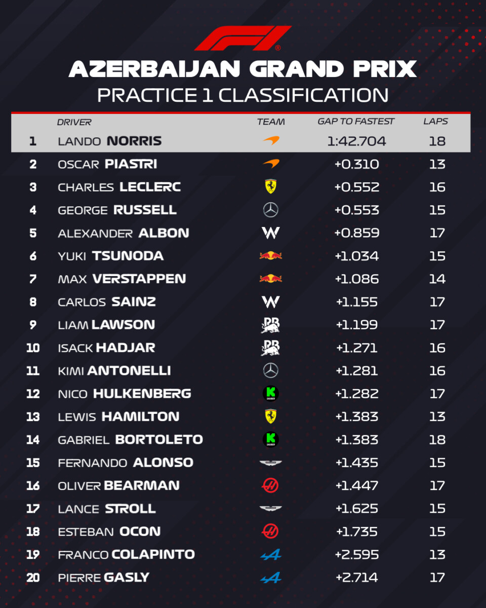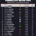È il rosso il colore dominante della prima giornata del GP dell’Azerbaijan, quello delle due Ferrari di Lewis Hamilton e Charles Leclerc che sono stati nettamente i più veloci in pista: l’1’41”293 ottenuto dal sette volte campione del mondo in FP2 è già un tempo inferiore a quello della pole position dello scorso anno (1’41”365), il cui autore, il monegasco, oggi pomeriggio è arrivato ad appena due millesimi da quel rilievo cronometrico. Al terzo posto del venerdì si è piazzata la Mercedes di George Russell (1’41”770), seguita a 9 millesimi dal compagno di squadra Andrea Kimi Antonelli.