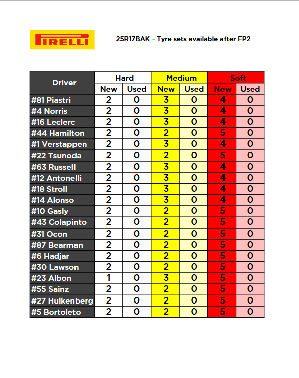Nella seconda sessione c’è stata un po’ più di varietà. Otto piloti (Piastri, Norris, Leclerc, Verstappen, Antonelli, Russell, Alonso, Stroll) hanno usato nuovamente solamente la Soft, in undici hanno assaggiato anche la C5 in combinazione con la C6. L’unica mosca bianca è stato Alex Albon che sulla sua Williams ha montato un set di Hard oltre a quello di Soft.