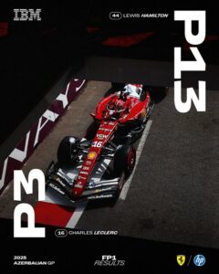 Avvio di weekend positivo per la Scuderia Ferrari a Baku. In totale Lewis Hamilton e Charles Leclerc hanno percorso 73 giri (34 per l’inglese e 39 per il monegasco) e chiuso il venerdì occupando le prime due posizioni.