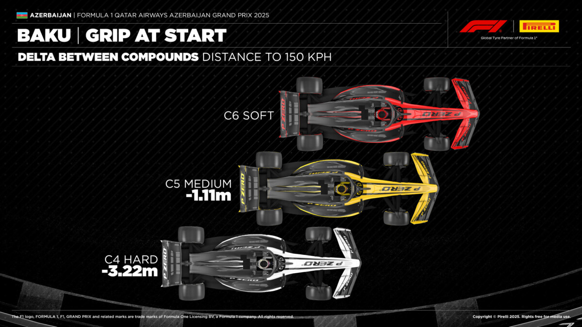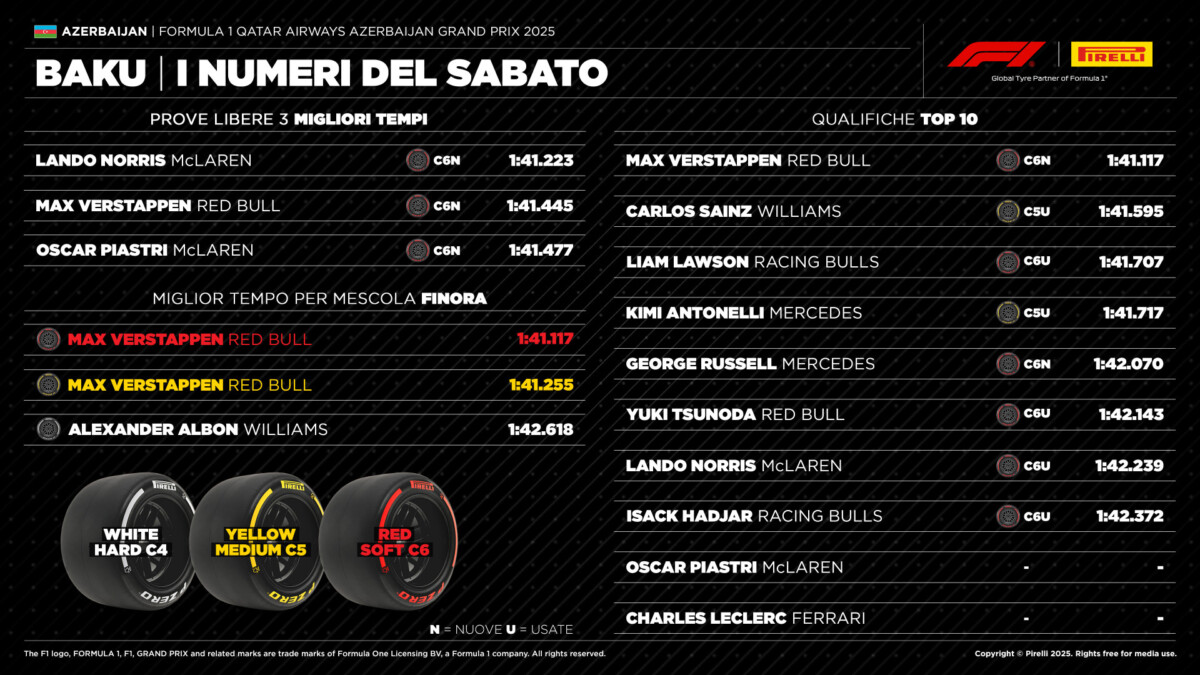 Nella terza sessione di prove libere la pista si è presentata decisamente in condizioni peggiori rispetto alla giornata precedente a causa della pioggia caduta nella notte e, soprattutto, del vento che portava molto sporco sull’asfalto. Il livello di grip è migliorato in maniera considerevole durante i sessanta minuti. Così come accaduto venerdì, le squadre hanno cercato di preservare il più possibile i tre set di Medium a disposizione, tanto che soltanto un pilota (Stroll) ha usato la C5. Sei piloti – le coppie di Alpine, Haas e Racing Bulls – hanno usato anche le Hard oltre alle Soft, con la C6 unica scelta da tutti gli altri 13 piloti.