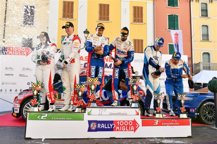 CLASSIFICA ASSOLUTA RALLY 1000 MIGLIA: 1. Crugnola-Sassi (Citroen C3) in 1:02’29.6; 2. Mabellini-Lenzi (Skoda Fabia RS) a 20.8; 3. Re-Pozzi (Skoda Fabia RS) a 1’21.7; 4. Testa-Bizzocchi (Skoda Fabia RS) a 1’28.7; 5. Aragno-Guzzi (Skoda Fabia RS) a 1’39.4; 6. Pinzano-Turati (Skoda Fabia RS) a 1’47.6; 7. Dall’Era-Beltrame (Skoda Fabia RS) a 2’03.7; 8. Pedersoli-Tomasi (Skoda Fabia RS) a 2’04.6; 9. Facco-Doria (Skoda Fabia RS) a 2’16.5; 10. Bondioni-D’Ambrosio (Skoda Fabia RS) a 2’25.7.
