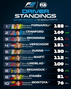 Nel recuperare il terreno perso, Leonardo Fornaroli ha dato vita a un acceso duello con Alex Dunne. Il rookie piacentino, nel tentativo di sorpassarlo, ha tamponato l’irlandese all’inizio del tredicesimo giro. Per questo episodio il pilota del team Invicta Racing ha ricevuto una penalità di dieci secondi. La reazione del campione in carica del FIA Formula 3 Championship non si è fatta attendere. Fornaroli ha inanellato una sequenza di giri veloci che gli hanno permesso si scalare la classifica fino a raggiungere la zona podio. Terzo sotto al traguardo, l’alfiere di ACI Team Italia è quindi retrocesso al quinto posto. Ciononostante Leonardo Fornaroli è ancora leader e del campionato riservato ai piloti con 19 lunghezze di vantaggio sul primo degli inseguitori Jak Crawford.