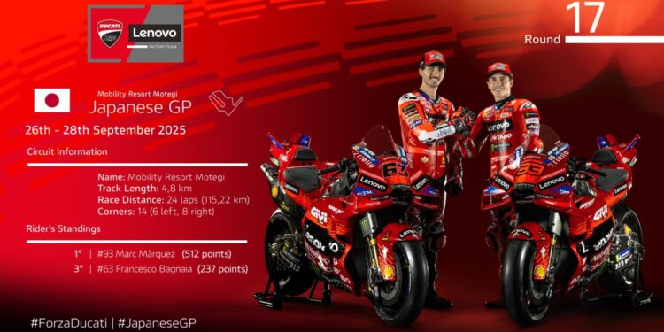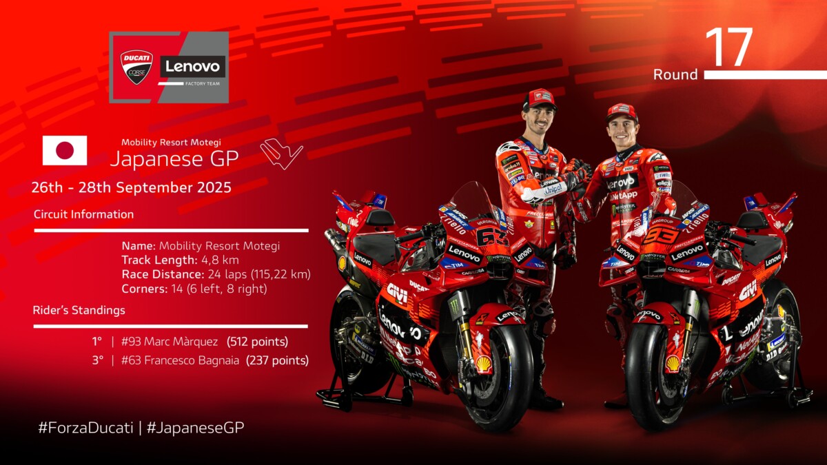Inizia la lunga trasferta tra Asia e Australia per il Ducati Lenovo Team. La prima tappa è in Giappone, sul tracciato della prefettura di Ibaraki, sede fissa del Motomondiale dal 2004. Nella terra del Sol Levante Márquez si gioca la sua prima chance iridata, mentre la Desmosedici GP può contare su una tradizione vincente: otto successi complessivi, dalla storica tripletta di Capirossi (2005, 2006, 2007), passando per le vittorie di Stoner (2010) e Dovizioso (2017), fino ai trionfi recenti di Miller, Martin e Bagnaia nelle ultime tre edizioni (2022, 2023 e 2024).