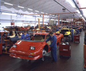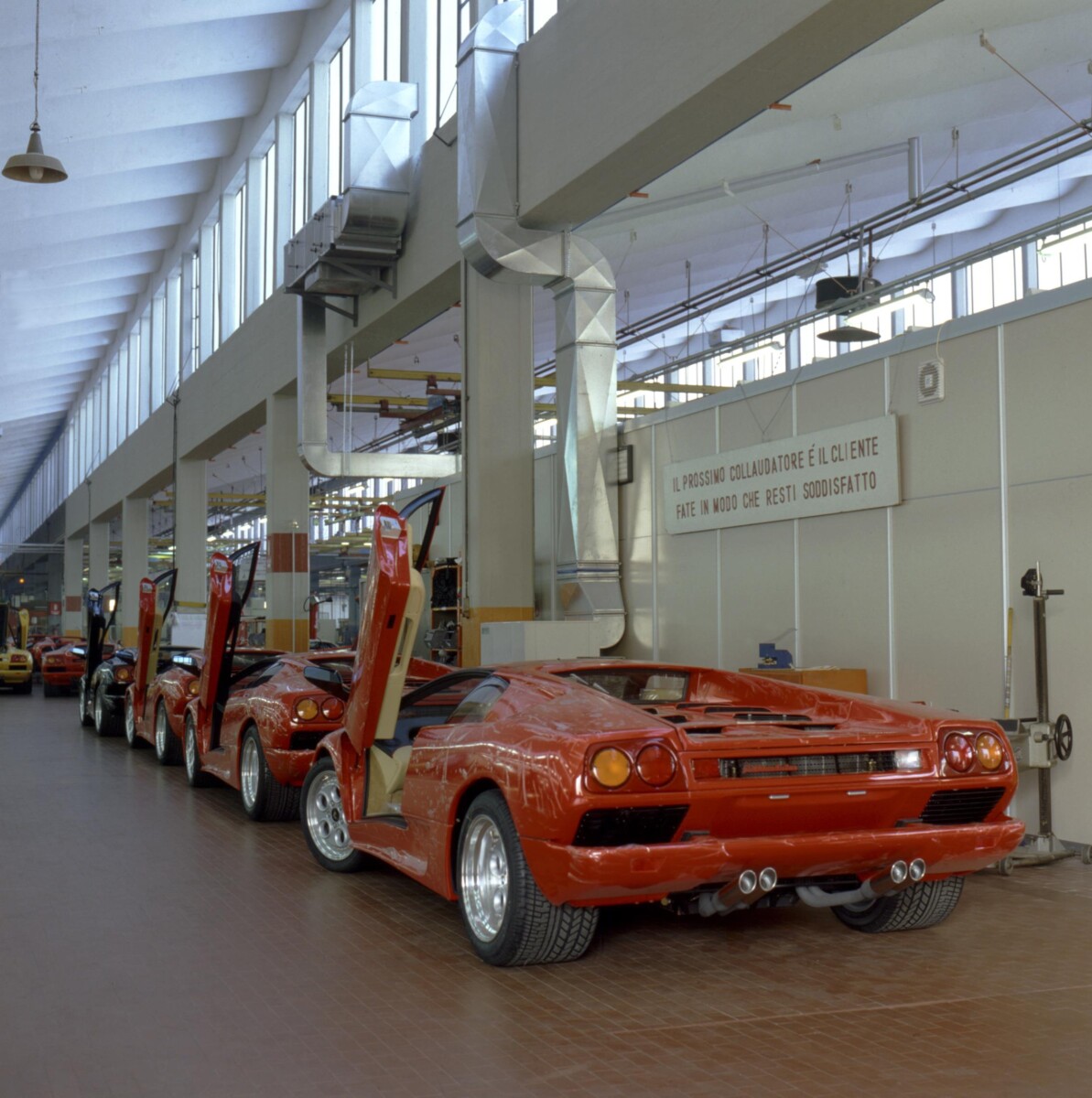 Il nome stesso evoca leggenda: Diablo, in omaggio all’omonimo toro da corrida leggendario che, nel 1869, si batté per ore contro il matador José de Lara, detto “El Chicorro”. Il debutto segna commercialmente un successo immediato con i primi ordini che arrivano già prima della presentazione, in un mondo che ancora non conosceva “preview” su social media e web. Con il suo V12 da 5,7 litri, 492 CV e 580 Nm di coppia, la Diablo accelera da 0 a 100 km/h in circa 4,5 secondi e stabilisce il nuovo record di velocità per vetture stradali, toccando i 337 km/h sul circuito di Nardò. Il telaio tubolare, la carrozzeria in alluminio e acciaio con inserti in fibra di carbonio, utilizzati per la prima volta su una vettura di serie, insieme alle sospensioni raffinate conferiscono alla Diablo un comportamento dinamico senza precedenti. Per la prima volta, una Lamborghini abbina prestazioni assolute a comfort innovativo, con sedili regolabili, alzacristalli elettrici, impianto stereo Alpine. Lusso, design e potenza si fondono senza compromessi.
