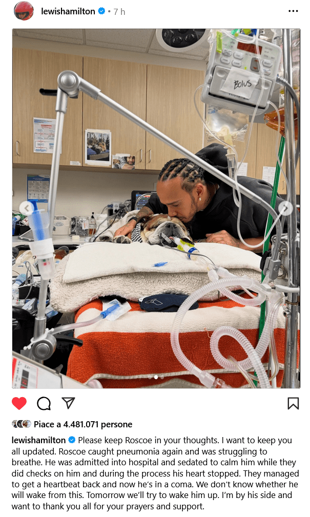 I più cinici si sono già scatenati, ma solo chi ha un cane sa. E da ieri Roscoe è nei nostri pensieri, ma soprattutto Lewis, un uomo che in questo momento baratterebbe tutti i suoi Titoli, i suoi successi, i suoi record, i suoi soldi e la sua fama per giocare e correre di nuovo con il suo amico. E per vederlo svegliarsi domani. Forza Roscoe e forza Lewis! Siamo con voi, con tutta la nostra energia!