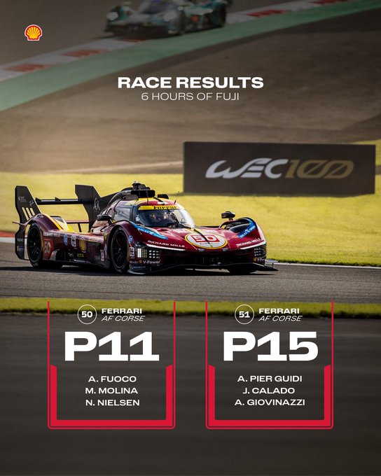 La trasferta giapponese, penultimo atto del FIA WEC 2025, si è confermata molto difficile per le Hypercar della Casa di Maranello, come dalle attese della vigilia. Ferrari si conferma comunque leader nel Campionato del Mondo Costruttori, e Pier Guidi, Calado e Giovinazzi rimangono in testa alla graduatoria del Mondiale Piloti. I Titoli verranno quindi attribuiti nell’ultimo atto stagionale che andrà in scena in Bahrain, con la 8 Ore in programma sabato 8 novembre.
