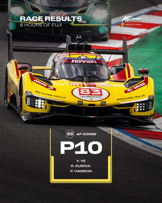 La 6 Ore del Fuji termina con le 499P della squadra ufficiale Ferrari – AF Corse in 11° e 15° posizione rispettivamente con gli equipaggi #50 e 51, formati da Antonio Fuoco-Miguel Molina-Nicklas Nielsen, e da Alessandro Pier Guidi-James Calado-Antonio Giovinazzi. Decima al traguardo la 499P del team privato AF Corse, affidata al pilota ufficiale del Cavallino Rampante Yifei Ye, insieme a Robert Kubica e Phil Hanson.