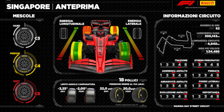 Nessun cambiamento rispetto allo scorso nella selezione delle mescole da asciutto: Pirelli ha infatti confermato la C3 come Hard, la C4 come Medium e la C5 come Soft per la gara di Marina Bay. Pur avendo un’opzione più morbida a disposizione, la C6, le valutazioni fatte prima della pausa estiva – le mescole per la seconda parte della stagione sono state annunciate durante il GP d’Ungheria – hanno escluso la gomma più morbida della gamma 2025 perché le energie esercitate sugli pneumatici e le temperature elevate che contraddistinguono questo appuntamento potevano creare qualche difficoltà sul piano del surriscaldamento. Del resto, in questa gara il degrado della prestazione dei pneumatici è causato principalmente dallo stress termico cui vengono sottoposti.