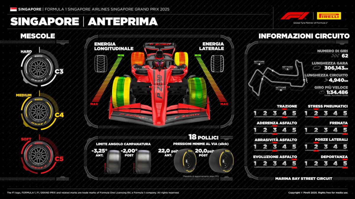 Nessun cambiamento rispetto allo scorso nella selezione delle mescole da asciutto: Pirelli ha infatti confermato la C3 come Hard, la C4 come Medium e la C5 come Soft per la gara di Marina Bay. Pur avendo un’opzione più morbida a disposizione, la C6, le valutazioni fatte prima della pausa estiva – le mescole per la seconda parte della stagione sono state annunciate durante il GP d’Ungheria – hanno escluso la gomma più morbida della gamma 2025 perché le energie esercitate sugli pneumatici e le temperature elevate che contraddistinguono questo appuntamento potevano creare qualche difficoltà sul piano del surriscaldamento. Del resto, in questa gara il degrado della prestazione dei pneumatici è causato principalmente dallo stress termico cui vengono sottoposti.