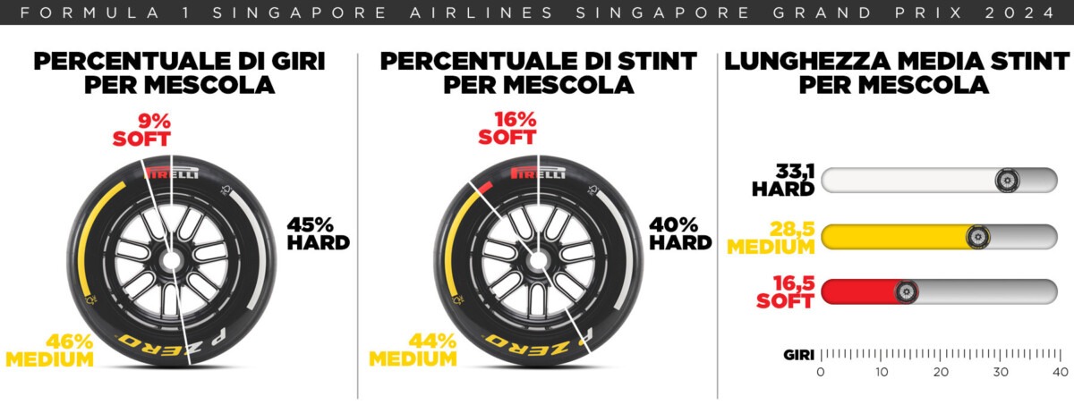 Quello di Marina Bay è uno dei tracciati più tortuosi del calendario. Lungo 4,940 chilometri, comprende 19 curve. Le modifiche introdotte nel 2023 ne hanno ridotto il numero (erano 23), trasformando la parte successiva alla curva 16 in un rettilineo di circa 400 metri di lunghezza. L’asfalto ha le stesse caratteristiche di quello delle strade cittadine limitrofe, con una rugosità molto bassa, e numerose sono anche le strisce della segnaletica che, in caso di pioggia, possono rappresentare un’insidia supplementare. Le vie di fuga sono limitate e le barriere di protezione sono molto vicine anche se la sede stradale è spesso piuttosto ampia. Ci sono ben quattro zone DRS ma, come scritto in precedenza, i sorpassi restano merce rara. L’aumento della velocità massima nella pit-lane, salito da 60 a 80 km/h, non dovrebbe avere un impatto significativo sulla strategia, con la sosta singola praticamente obbligata. Le variabili imprevedibili possono essere le neutralizzazioni e le condizioni meteorologiche che, all’Equatore, sono molto mutevoli. Eventuali temporali, non certo infrequenti, possono anche rimuovere la gommatura e resettare le condizioni dell’asfalto, influenzando così anche la prestazione delle gomme.
