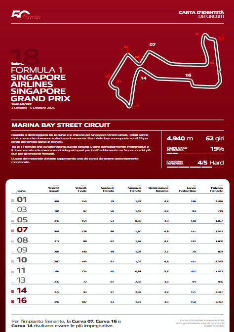 La curva più impegnativa del Marina Bay Street Circuit per l’impianto frenante è la 7, nota come Memorial perché vicina al memoriale che onora le vittime civili della Seconda guerra mondiale: le monoposto vi arrivano a 308 km/h e scendono a 128 km/h in 1,9 secondi durante i quali percorrono 96 metri. In questa fase i piloti subiscono una decelerazione di 4,9 g e il carico che esercitano sul pedale del freno è di 151 kg. La potenza frenante è invece di 2.542 kW.