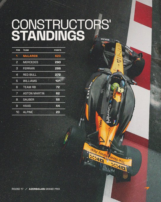 Dopo aver fallito il primo match point a Baku, la McLaren potrebbe conquistare il titolo Mondiale Costruttori questo fine settimana. Forte di 623 punti ne ha 333 di vantaggio sulla Mercedes e 337 sulla Ferrari. Mancando 4 week-end standard e 3 con le Sprint, restano da assegnare 346 punti. Di conseguenza la McLaren può diventare campione ottenendo appena 13 punti: le basta un podio, o un 4° posto combinato con un 10°, così come l’accoppiata 5°-8° posto o ancora 6°-7° posto.