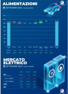Il percorso verso la transizione energetica procede ancora con eccessiva lentezza. La quota di vetture elettriche pure (BEV) mostra un incremento rispetto al 4,9% di agosto e al 5,2% di settembre 2024, ma comunque si ferma a un modestissimo 5,6% del mercato. Per quanto riguarda le auto PHEV, settembre registra una quota dell’8,7%, in crescita rispetto al 7,1% di agosto e al 3,4% di settembre 2024, confermando un andamento positivo che trae vantaggio dalla nuova normativa sui fringe benefits. Complessivamente, a settembre la quota totale delle ECV si attesta al 14,3%.