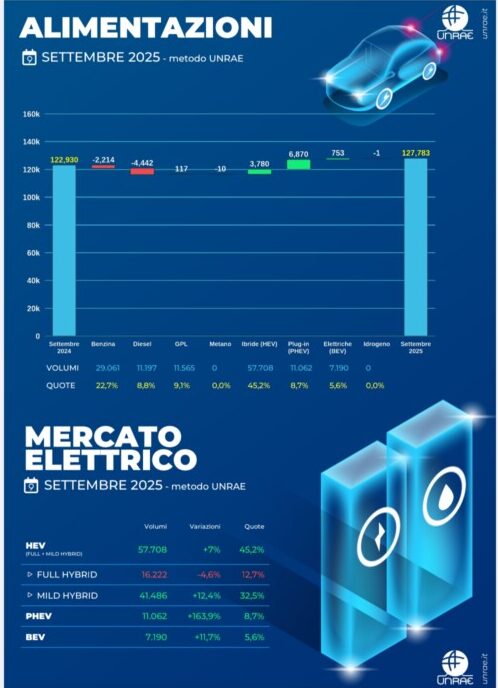 Tra le alimentazioni, a settembre il motore a benzina cede in volume e perde 2,7 punti, scendendo al 22,7% (25,4% nel cumulato, -4,0 p.p.). Il diesel scende all’8,8% di share (-3,9 p.p. e al 9,6% in gennaio-settembre, -4,5 p.p.); il Gpl, seppur in lieve crescita in volume, scende al 9,1% a settembre (-0,2 p.p.) e al 9,2% nel cumulato (-0,2 p.p.). Le vetture ibride nel mese raggiungono il 45,2% (+1,3 p.p.) e il 44,6% (+5,0 p.p.) nei 9 mesi, con un 12,7% per le “full” hybrid e 32,5% per le “mild” hybrid in settembre. Come anticipato, le auto BEV si portano al 5,6% del totale (+0,4 p.p. e al 5,2% in gennaio-settembre, +1,2 p.p.), mentre le PHEV salgono all’8,7% (+5,3 p.p. e al 6,0% nei 9 mesi, +2,7 p.p.).