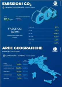 L’analisi delle immatricolazioni di settembre per fascia di CO2 riflette l’andamento nel mese di auto BEV e PHEV: la fascia 0-20 g/Km rappresenta il 10,1% del mercato, il 3,7% la fascia 21-60 g/Km (rispettivamente 8,1% e 3,0% nel cumulato). La fascia 61-135 g/Km rappresenta il 63,8% (65,9% nel cumulato), mentre la quota delle vetture da 136 a 190 g/Km si porta al 18,1% e quella della fascia oltre i 190 g/Km al 2,1% (rispettivamente 19,0% e 2,0% nei 9 mesi).