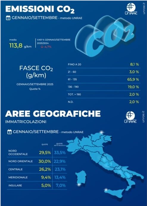 Sul fronte delle aree geografiche, in settembre il Nord Ovest conferma la leadership, con una quota in crescita al 31,2% (al 29,5% in gennaio-settembre, +1,2 p.p.). Il Nord Est perde 1,9 punti, al 26,2% del totale (30,0% nel cumulato), grazie al contributo del noleggio, senza il quale scenderebbe di 3,2 punti, al 23,0%. Il Centro Italia sale al 27,6% nel mese (+1,9 p.p., al 26,2% in gennaio-settembre), l’area meridionale scende al 9,9% e le Isole al 5,2% (rispettivamente 9,4% e 5,0% nel cumulato). Le emissioni medie di CO2 delle nuove immatricolazioni in settembre flettono del 6,3% a 110,1 g/Km e del 4,7% nei 9 mesi a 113,8 g/Km.