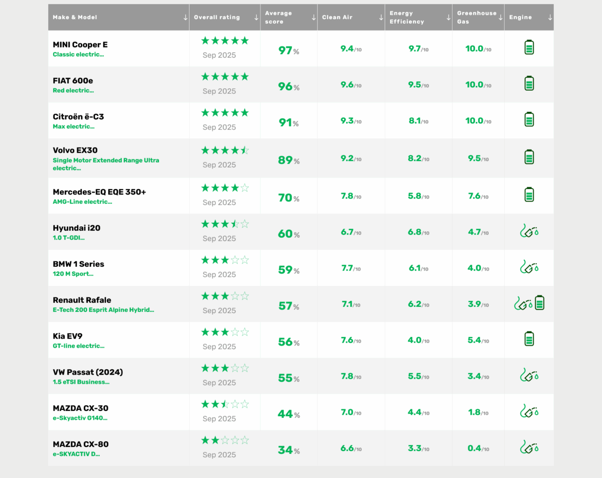 Ben dodici le auto analizzate da Green NCAP nella terza serie di test del 2025: elettriche pure, Citroën ë-C5; FIAT 600e; MINI Cooper E, Mercedes EQE 350+, Kia EV9 e Volvo EX30; a benzina, Hyundai i20 e BMW Serie 1; ibrida, Mazda CX-30; full hybrid, Renault Rafale; mild-hybrid, VW Passat; diesel, Mazda CX-80. In questa sessione di test, per la prima volta, viene introdotta la Valutazione di Green NCAP sull’intero ciclo di vita (CLA) dei nuovi veicoli, questo ci consente di poter comparare il reale impatto ambientale delle autovetture e confrontare efficienza, autonomia e capacità di ricarica. Per i conducenti di veicoli elettrici, Green NCAP include anche una nuova valutazione complementare sull’esperienza di guida, che comprende, tra gli altri, le funzioni di ricarica e di riscaldamento dell’abitacolo. Al primo posto nella classifica generale della sostenibilità troviamo due modelli iconici con una storia che risale rispettivamente al 1959 e al 1955: MINI Cooper E e FIAT 600e.