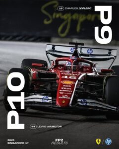 Ferrari solo 9° e 10° al termine della prima giornata di libere del GP di Singapore, ma produttiva a detta dei piloti. Come ha dichiarato Charles Leclerc: “Nel complesso è stata una giornata un po’ difficile. La prima sessione ci ha dato alcune indicazioni positive e siamo riusciti a costruire una buona base, mentre la seconda, un po’ per tutti, è stata molto più caotica e non siamo riusciti a mettere insieme tutto come volevamo. Credo che il passo ci sia e dobbiamo massimizzarne il potenziale eseguendo ogni fase al meglio facendo combaciare tutti i pezzi. Non so se saremo in lotta per la pole, ma l’obiettivo è qualificarci bene e metterci in condizione di avere le migliori possibilità per la gara di domenica”.