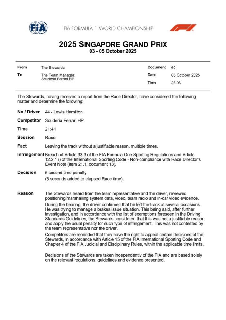 Cinque secondi di penalità per Lewis Hamilton dopo la fine del GP di Singapore, che fanno scivolare il pilota Ferrari dal settimo all’ottavo posto. Il #44 secondo quanto riportato dalla FIA “ha superato i track limits più volte e senza motivi giustificabili” quando cercava di gestire un problema ai freni nelle fasi finali della gara. Hamilton cede quindi la posizione d’arrivo a Fernando Alonso e perde due punti. La decisione della FIA non è stata contestata né dalla Ferrari né dal pilota.
