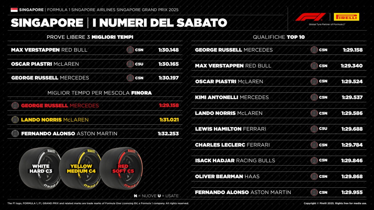 È George Russell il poleman della sedicesima qualifica nella storia del GP di Singapore. Il pilota della Mercedes ha conquistato la settima pole della carriera, la seconda nel 2025 dopo quella di Montreal, dove poi vinse la gara. Russell ha ottenuto un miglior tempo di 1’29”158 nel suo secondo tentativo di Q3, migliorandosi di sette millesimi rispetto al tentativo precedente che gli sarebbe comunque valso la pole. Per la Mercedes questa è la quarta partenza al palo a Singapore, la prima dal 2018, nonché la numero 143 nella sua storia. Accanto a lui partirà la Red Bull di Max Verstappen (1’29”340), cui ancora una volta è sfuggita la pole su questa pista. In seconda fila ci saranno la McLaren di Oscar Piastri (1’29”524) e l’altra Mercedes, quella di Andrea Kimi Antonelli (1’29”537).