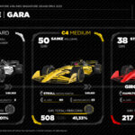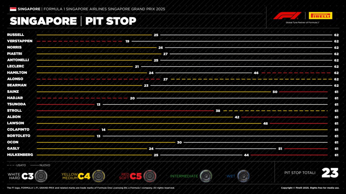 Medium e Soft sono state le gomme scelte per la prima parte della gara. Come previsto la maggior parte dei piloti (14) ha optato per la C4 mentre in sei (Verstappen, Tsunoda, Stroll, Alonso, Colapinto e Hadjar) hanno preferito la C5. Un’eventuale scelta della Hard per il primo stint è stata scartata perché la pista era ancora un po’ umida dopo la pioggia caduta nel tardo pomeriggio. Per il secondo stint, la Hard è stata la mescola preferita ma la Soft ha comunque continuato ad essere protagonista, con tre piloti (Lawson, Albon e Sainz) che hanno fatto il loro secondo stint con la C5 e altri tre che hanno effettuato due soste (Hamilton, Gasly, Hulkenberg). In totale, C3 e C4 hanno avuto un utilizzo pressoché uguale: 508 giri la Medium, quattro in meno la Hard. Rispetto allo scorso anno, è più che raddoppiato l’impiego della Soft, passato dall’8,67% del totale dei giri percorsi del 2024 al 17,66% di quest’anno. Continua a sfuggire a Max Verstappen il successo nel GP di Singapore, secondo per la terza volta (quarta sul podio).