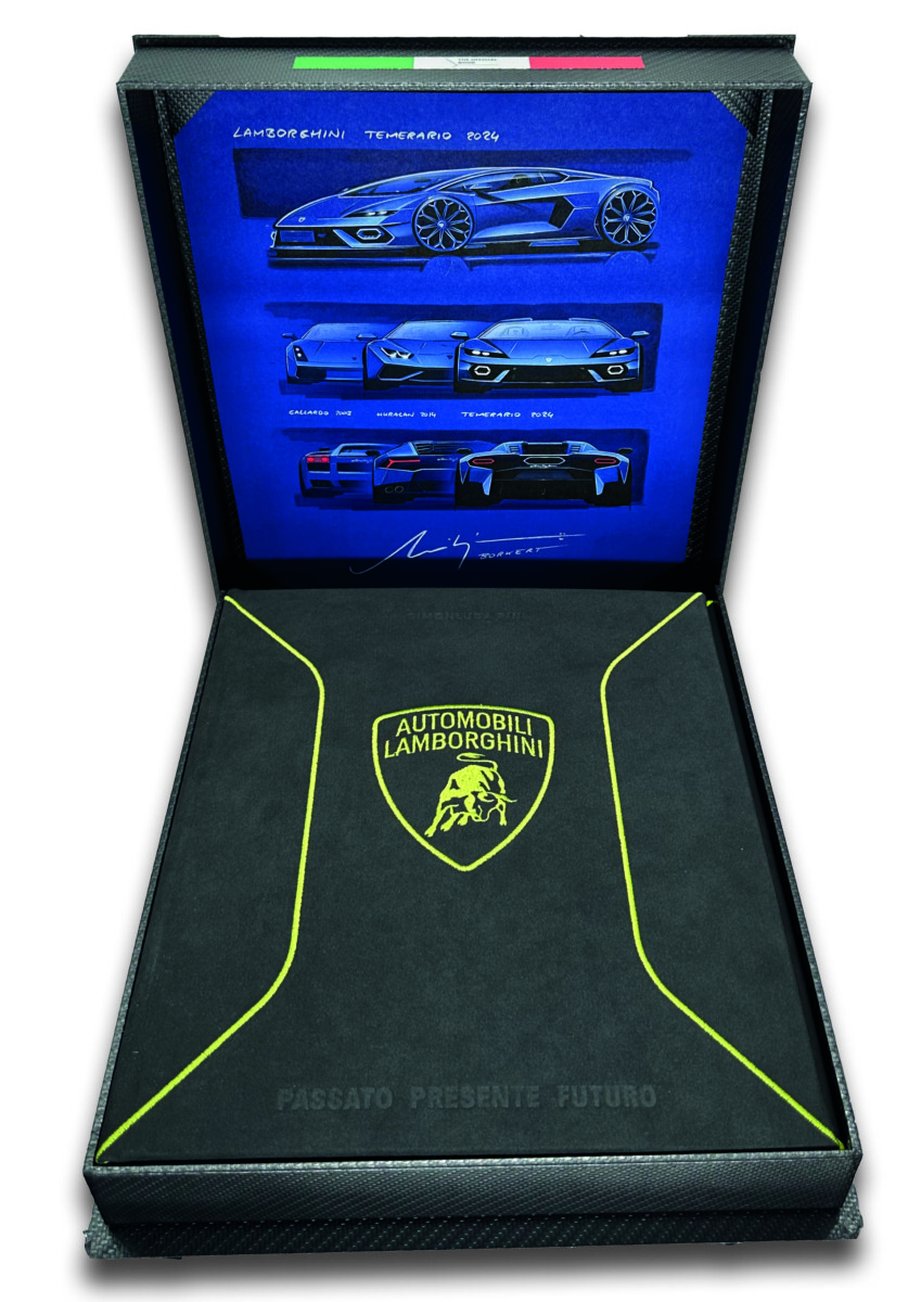Dalla Miura all’addio di Ferruccio, dal 60° anniversario al presente elettrificato, questo pregiato libro sulle Lamborghini è un’ode a una delle più grandi eccellenze italiane. Il volume sarà disponibile in due edizioni, di cui una esclusiva proposta in un lussuoso cofanetto a tiratura limitata, per ripercorrere la storia della Lamborghini. Un volume da collezionare, perfetto per chi ama i motori e soprattutto le Lamborghini. Questa edizione in cofanetto, con texture che richiama il carbonio, include un poster esclusivo con i bozzetti della nuova Temerario. La copertina è rivestita in microfibra Corsatex by Dinamica, la stessa dei sedili Lamborghini.