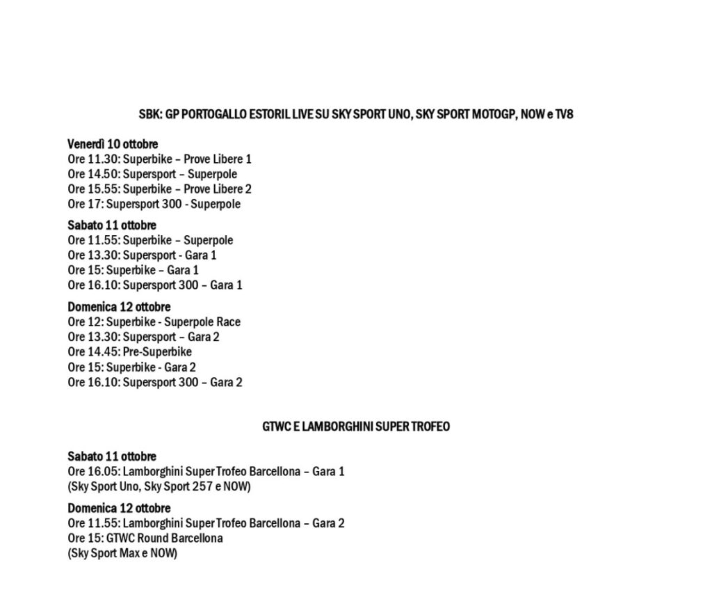 Undicesimo e penultimo appuntamento stagionale per il WSBK, che torna in Portogallo per il round dell’Estoril. Il weekend parte venerdì alle 11.30 con la prima sessione di libere, mentre alle 15.55 si torna in pista per la seconda sessione. Sabato alle 11.55 la Superpole, mentre alle 15.00 parte Gara 1 che assegna i primi punti. Domenica sempre alle 15.00 al via Gara 2. In pista anche Supersport e Supersport 300.