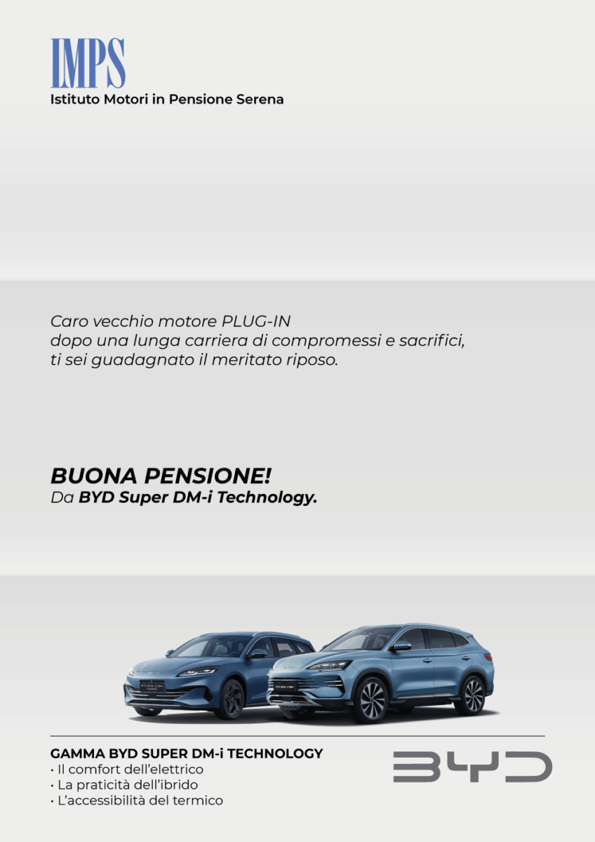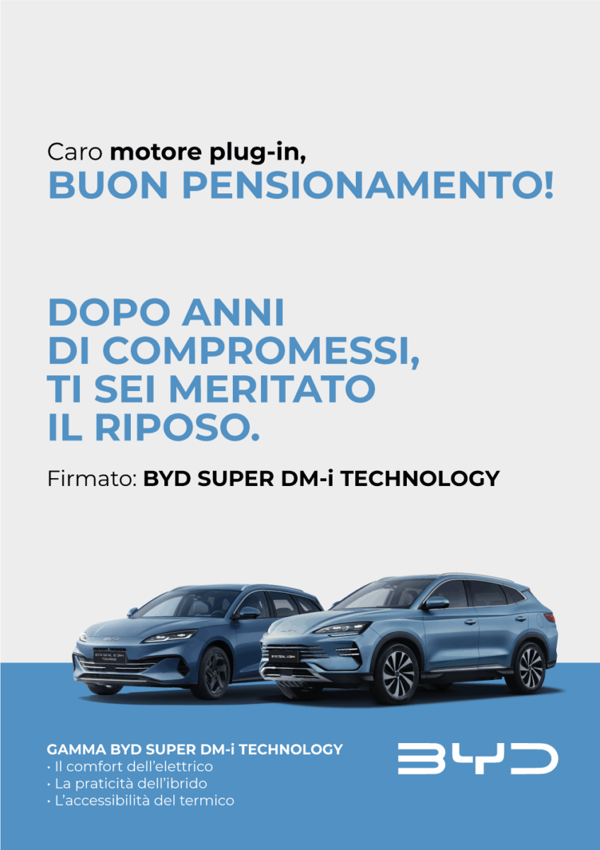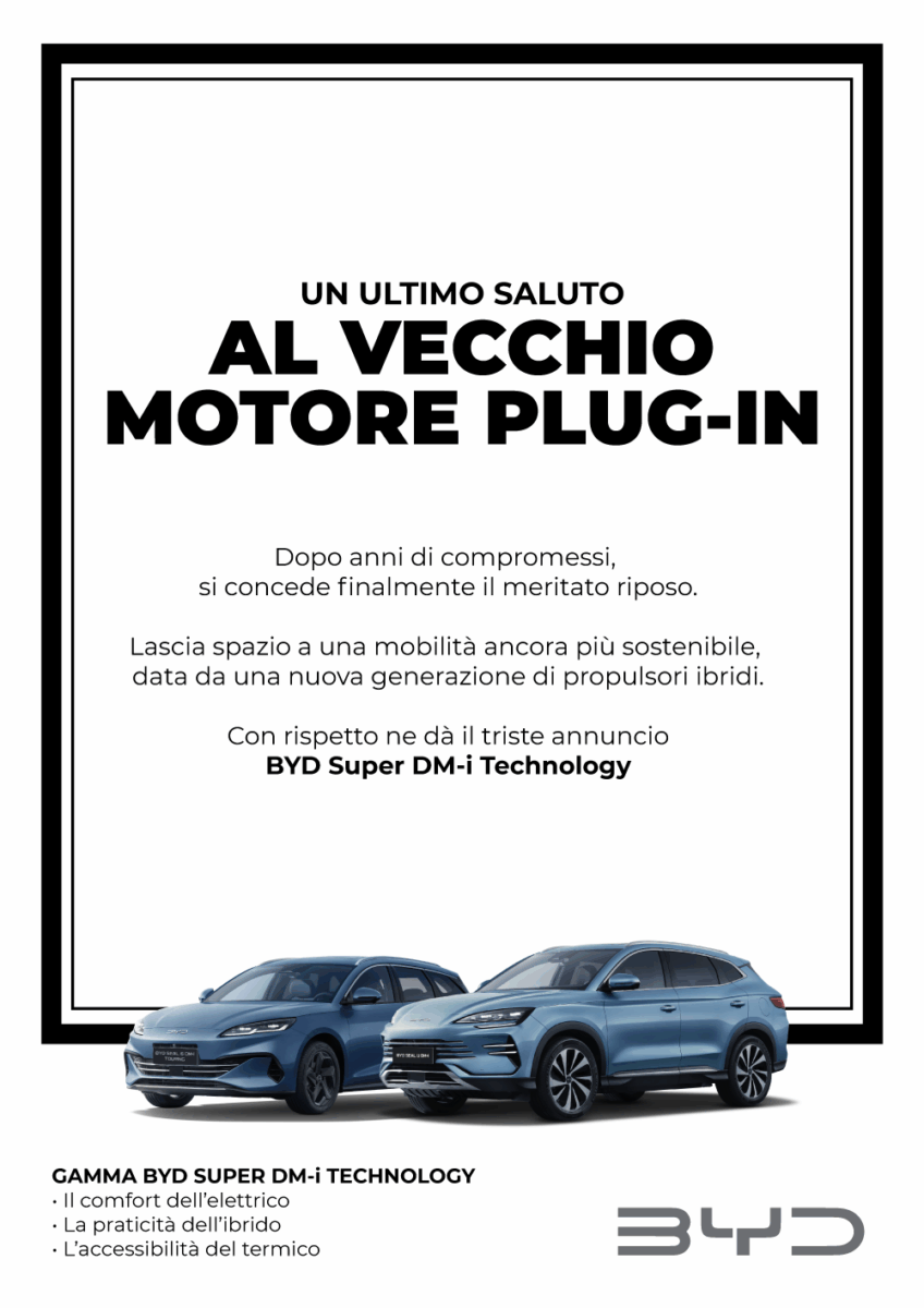 BYD lancia una nuova iniziativa promozionale che segna un punto di svolta nella comunicazione e nella tecnologia del marchio. Dopo campagne come “CASI-NO Incentivi Statali”, il principale produttore mondiale di Veicoli a Nuova Energia prosegue nel suo percorso di messaggi diretti e di rottura, rendendo omaggio al “vecchio motore plug-in” e annunciandone simbolicamente la pensione.