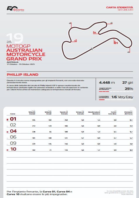 Secondo i tecnici Brembo che lavorano a stretto contatto con tutti i piloti della MotoGP, il Phillip Island Circuit da 4,448 km di lunghezza è il meno impegnativo per i freni della stagione 2025. In una scala da 1 a 6 presenta un indice di difficoltà di 1 perché le frenate in un giro sono appena 6 per nemmeno 22 secondi complessivi. Per di più presenta un’unica frenata della categoria High e 2 sono Medium.