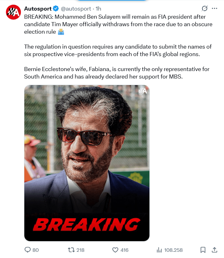 Con un post pubblicato su Twitter, Autosport ha annunciato che Mohammed Ben Sulayem resterà presidente FIA dopo che il candidato Tim Mayer si è ritirato ufficialmente a causa di una questione normativa. Il regolamento richiede infatti che ogni candidato indichi i nomi di sei possibili vice-presidenti provenienti da ciascuna delle aree globali della FIA. In pratica, è obbligatorio che ogni candidato abbia il supporto di almeno un membro del consiglio di ogni regione. Ma, dato che alcune regioni hanno un solo membro, diventa praticamente impossibile per i nuovi candidati se Ben Sulayem ha già quella persona dalla sua. Come nel caso della moglie di Bernie Ecclestone, Fabiana, che attualmente è l’unica rappresentante per il Sud America e ha già dichiarato il suo supporto a Mohammed Ben Sulayem. Ergo, partita chiusa. Mr E dice la sua anche in questa occasione, seppur indirettamente… Ma secondo voi siamo di fronte a elezioni eque e, soprattutto, democratiche?