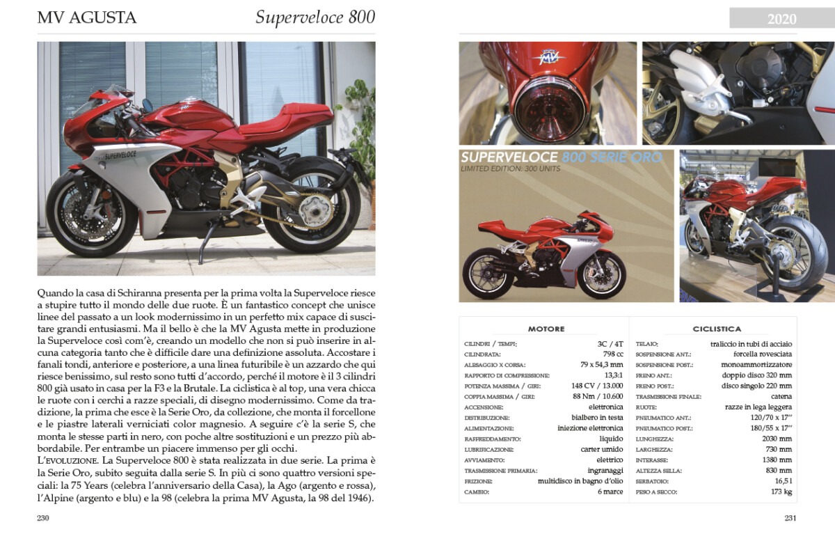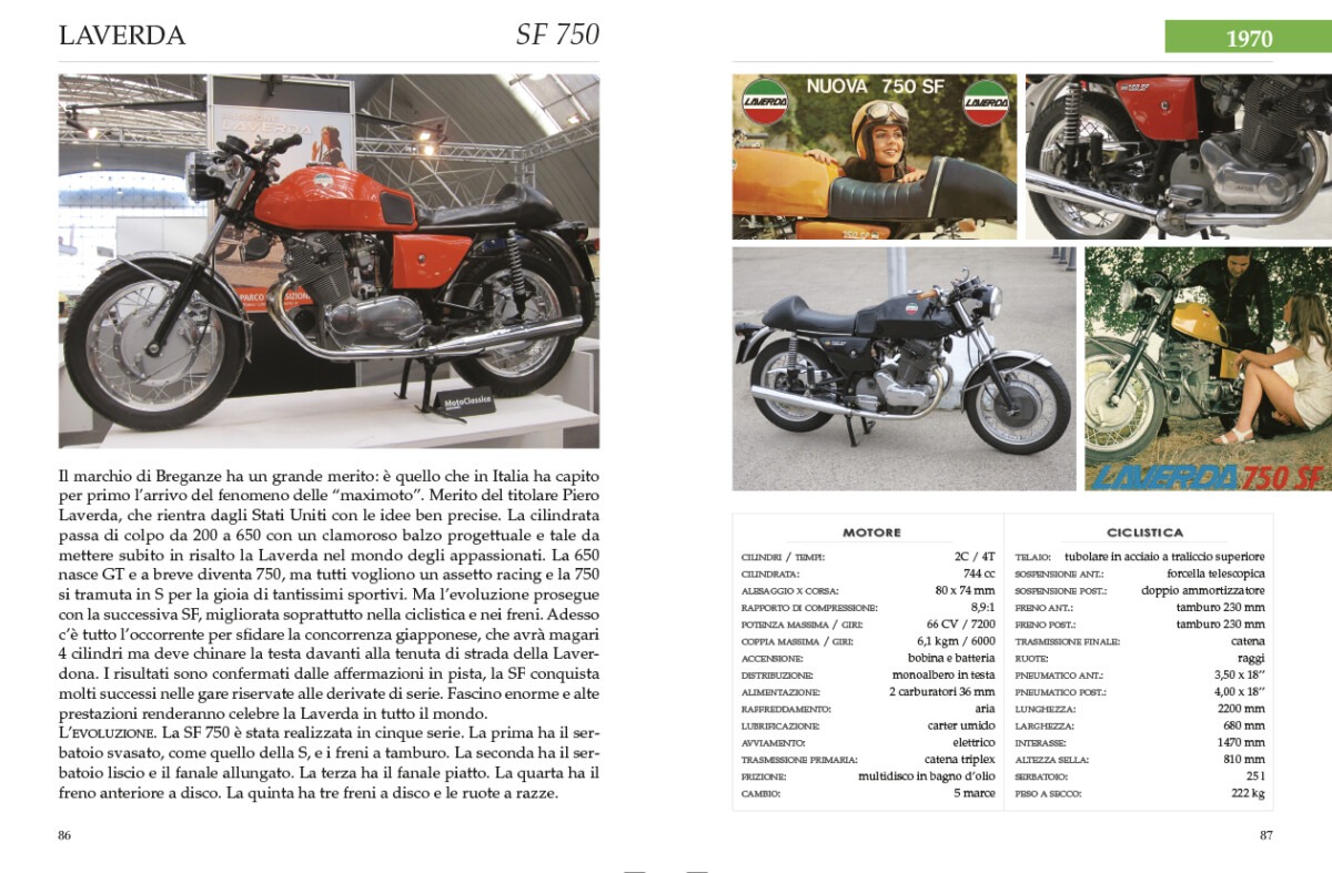 Benelli, Gilera, Moto Guzzi, Rumi, Parilla, MV Agusta, Morini, Laverda, Aermacchi, Ducati, Bimota, Aprilia sono solo alcuni dei marchi contenuti nel volume. In questo libro c’è il meglio del meglio: i 100 modelli più significativi in oltre 100 anni. A ognuna di queste pietre miliari è dedicata una scheda comprensiva di un testo di inquadramento storico, una dettagliata scheda tecnica oltre a immagini d’epoca accanto ad altre scattate oggi.