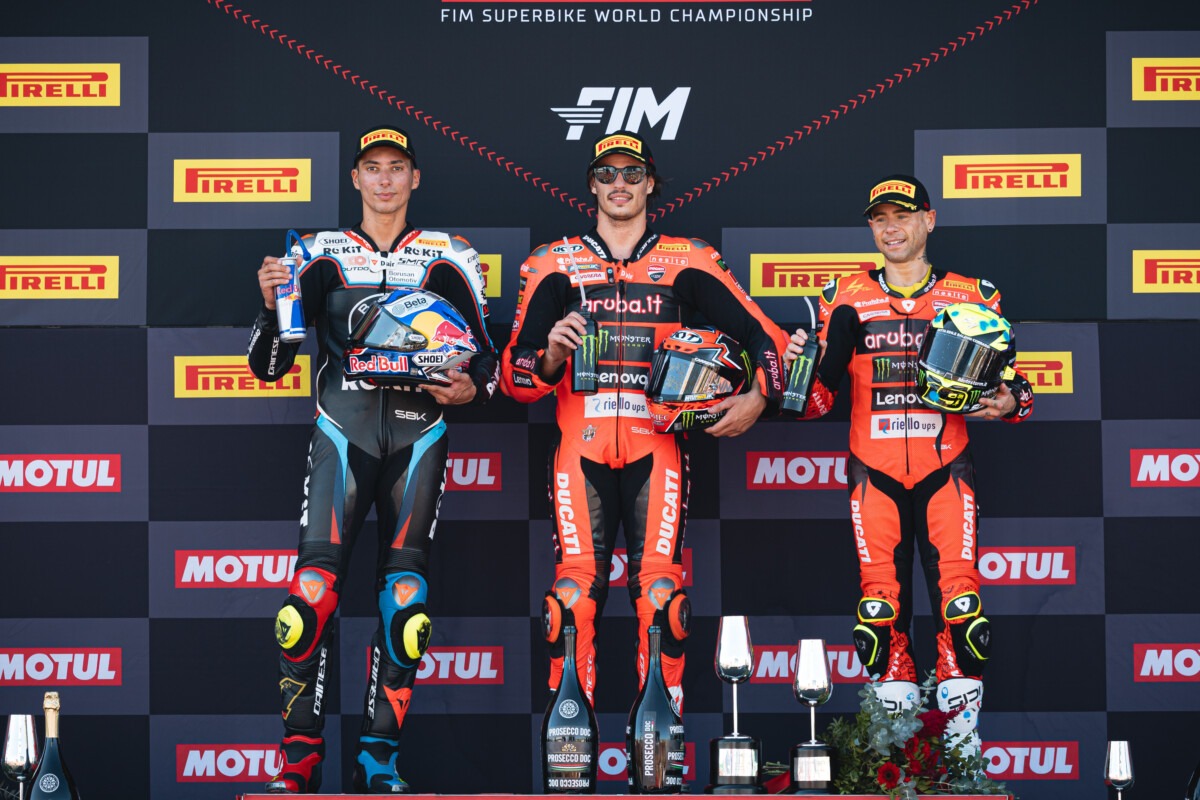 Per Gara1, Bulega ha cambiato completamente specifiche, scegliendo l’anteriore hard SC2 di gamma e il posteriore SCX di sviluppo in specifica E0126. Con questa combinazione ha vinto con quasi quattro secondi di vantaggio su Toprak Razgatlioğlu (BMW), anche lui con la stessa scelta di pneumatici. Terzo al traguardo Álvaro Bautista (Ducati), miglior classificato tra i piloti che hanno optato per la nuova media anteriore di sviluppo in specifica E0672. Tra coloro che hanno invece preferito la media di gamma SC1, il migliore è stato Alex Lowes (Bimota), sesto all’arrivo. La SCX di sviluppo E0126 è stata la scelta unanime per il posteriore. Per completare i 20 giri di Gara1, Bulega ha impiegato quasi 13 secondi in meno rispetto alla stessa gara del 2024, per un miglioramento medio sul giro di 6 decimi abbondanti.
