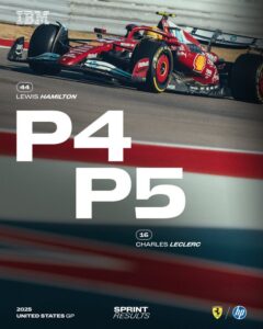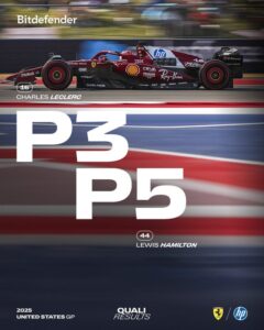 Dopo la quarta e quinta posizione nella Sprint Race (che hanno fruttato 9 punti), i piloti Ferrari hanno concluso le qualifiche del GP degli USA col terzo e quinto tempo. Secondo quanto dichiarato dal team principal Fred Vasseur: “Il nostro passo è stato competitivo fin dall’inizio della Q1 e siamo sempre rimasti nelle prime quattro posizioni. Poi, nel primo giro cronometrato della Q3, Lewis è andato dritto in curva 1 e Charles è andato in testacoda, ritrovandosi rispettivamente in nona e decima posizione, quindi eravamo un po’ in difficoltà. Tuttavia, alla fine sono riusciti a mettere insieme un buon giro, anche se non è stato il migliore della giornata. Ora, come sempre, ci concentreremo su noi stessi per vedere cosa potremo fare in gara. Per quanto riguarda la Sprint, abbiamo conquistato alcuni punti e speriamo di aggiungerne altri nel GP”.