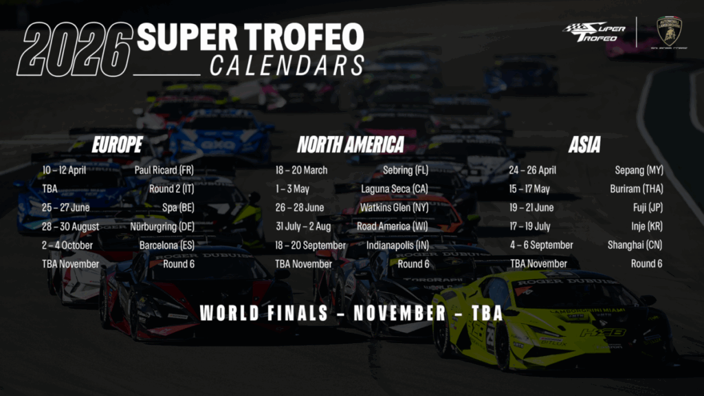 Il campionato riservato alle Lamborghini Huracán Super Trofeo EVO2 si svolgerà nei tre continenti con un totale di 36 gare in 16 tra i più importanti circuiti al mondo. Sei doppi appuntamenti per ciascuna delle tre serie Europa, Asia e North America. Trentasei gare, per un totale di circa 1800 minuti di adrenalina e spettacolo; 16 differenti circuiti in tre continenti. Il Lamborghini Super Trofeo conferma lo stesso format degli anni passati, annunciando i calendari della stagione 2026 che vedrà ancora protagoniste le Lamborghini Huracán Super Trofeo EVO2, pronte a concludere un ciclo prima del debutto della nuova Temerario Super Trofeo previsto per l’anno successivo.