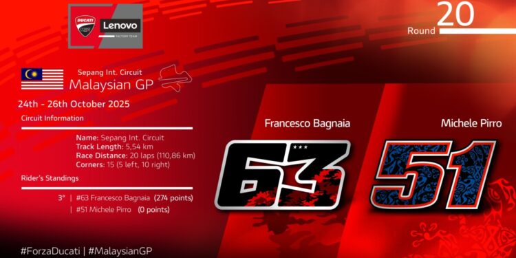 Ultima tappa extra europea della stagione 2025 per il Ducati Lenovo Team che arriva al Sepang International Circuit di nuovo con la coppia Bagnaia-Pirro. Come comunicato, Marc Marquez continua il recupero post intervento chirurgico e non sarà presente all’evento. A Sepang, pista alle porte della metropoli di Kuala Lumpur, si corre stabilmente dal 1999. Ben otto i trionfi Ducati, ottenuti in epoche e periodi diversi: nel 2005 è Loris Capirossi a centrare l’impresa, poi la doppietta di Stoner tra il 2007 e il 2009, prima di un digiuno lungo 7 anni. Ci pensa Andrea Dovizioso a riportare la Desmosedici GP sul gradino più alto del podio nel 2016 e nel 2017. Chiude l’albo d’oro della casa di Borgo Panigale su questo tracciato la tripletta delle ultime tre edizioni: nel 2022 è Pecco Bagnaia a vincere, poi Enea Bastianini nel 2023 e ancora Pecco lo scorso anno.
