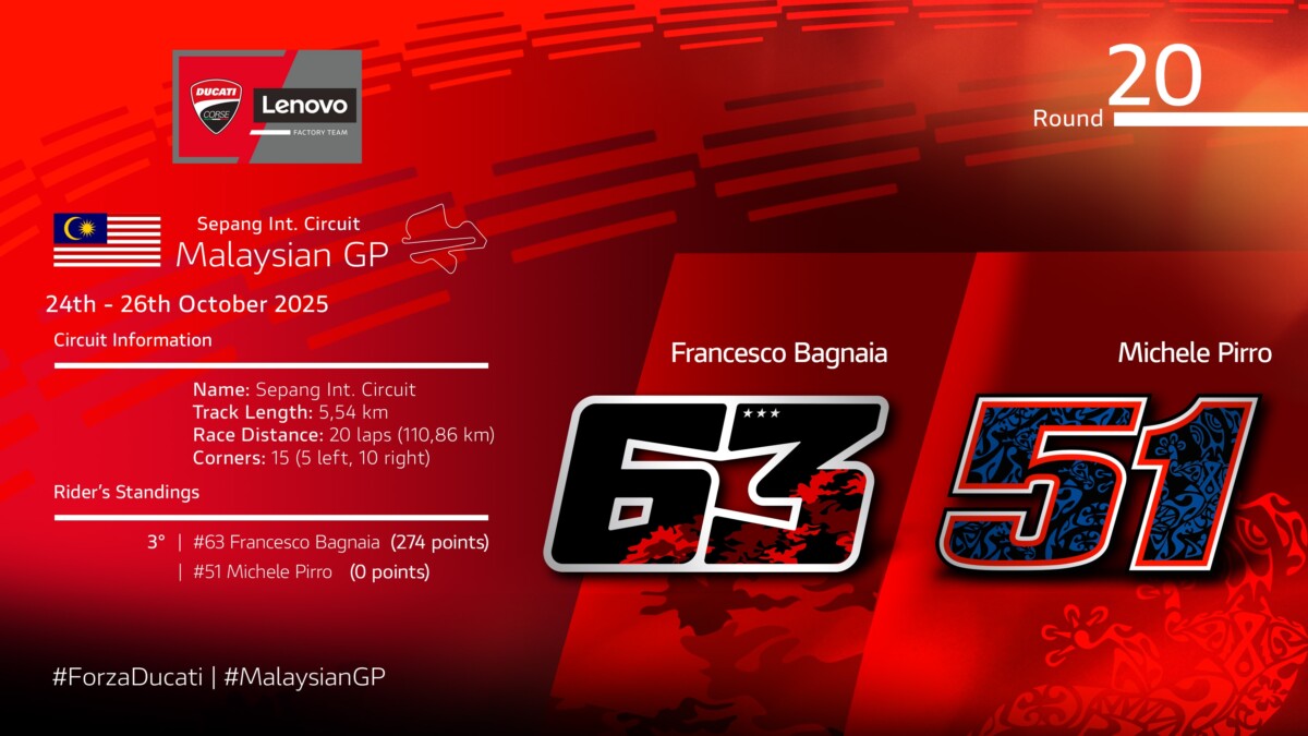 Ultima tappa extra europea della stagione 2025 per il Ducati Lenovo Team che arriva al Sepang International Circuit di nuovo con la coppia Bagnaia-Pirro. Come comunicato, Marc Marquez continua il recupero post intervento chirurgico e non sarà presente all’evento. A Sepang, pista alle porte della metropoli di Kuala Lumpur, si corre stabilmente dal 1999. Ben otto i trionfi Ducati, ottenuti in epoche e periodi diversi: nel 2005 è Loris Capirossi a centrare l’impresa, poi la doppietta di Stoner tra il 2007 e il 2009, prima di un digiuno lungo 7 anni. Ci pensa Andrea Dovizioso a riportare la Desmosedici GP sul gradino più alto del podio nel 2016 e nel 2017. Chiude l’albo d’oro della casa di Borgo Panigale su questo tracciato la tripletta delle ultime tre edizioni: nel 2022 è Pecco Bagnaia a vincere, poi Enea Bastianini nel 2023 e ancora Pecco lo scorso anno.