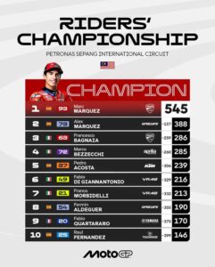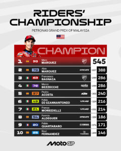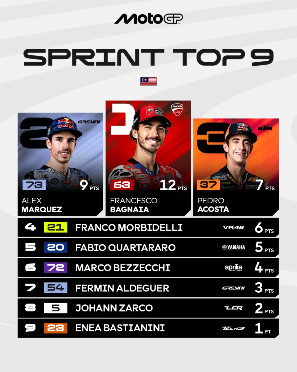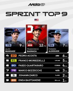 Partito dalla pole, Francesco Bagnaia ha dominato la Sprint del GP della Malesia, in testa dall’inizio alla fine. Secondo posto per Alex Marquez (BK8 Gresini Racing MotoGP) che è matematicamente vicecampione del mondo. Il podio è completato dall’altro pilota del team Gresini Fermín Aldeguer (BK8 Gresini Racing MotoGP, che conquista il titolo di ‘Rookie of the Year’. Alle spalle di Bagnaia, Alex Marquez e Aldeguer troviamo Acosta e Morbidelli. Sesto posto per Quartararo davanti a Bezzecchi, con Zarco ed Enea Bastianini (Red Bull KTM Tech3) a chiudere la zona punti. Decimo posto per Fabio Di Giannantonio (Pertamina Enduro VR46 Racing Team). Domenica alle 8:00 ora italiana la gara.