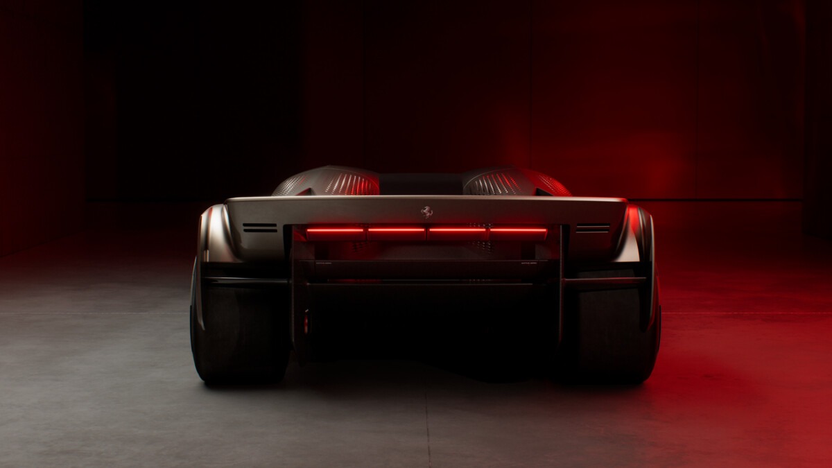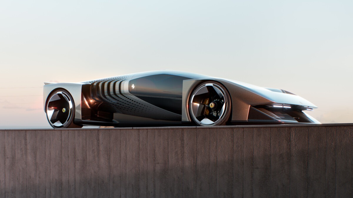 Il fianco presenta tagli verticali di reminiscenza F80, rimarcando l’ispirazione che il linguaggio tecnico-stilistico introdotto dalla nuova supercar di Maranello sia destinato a influenzare i futuri modelli di produzione. Questo linguaggio si manifesta nel contrasto tra le linee tese e tecniche dei parafanghi e il corpo vettura scultoreo, con un’estetica resa ancora più efficace dall’ottimizzazione matematica gestita da algoritmi generativi.